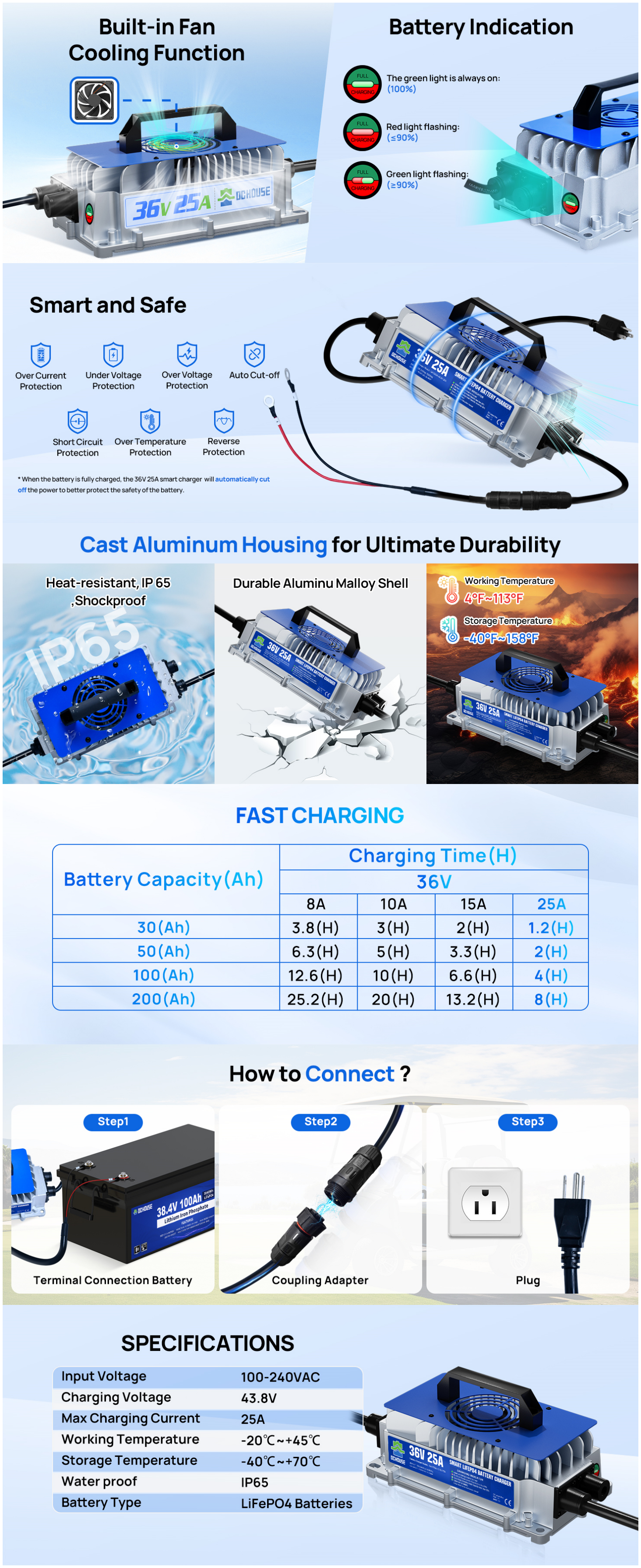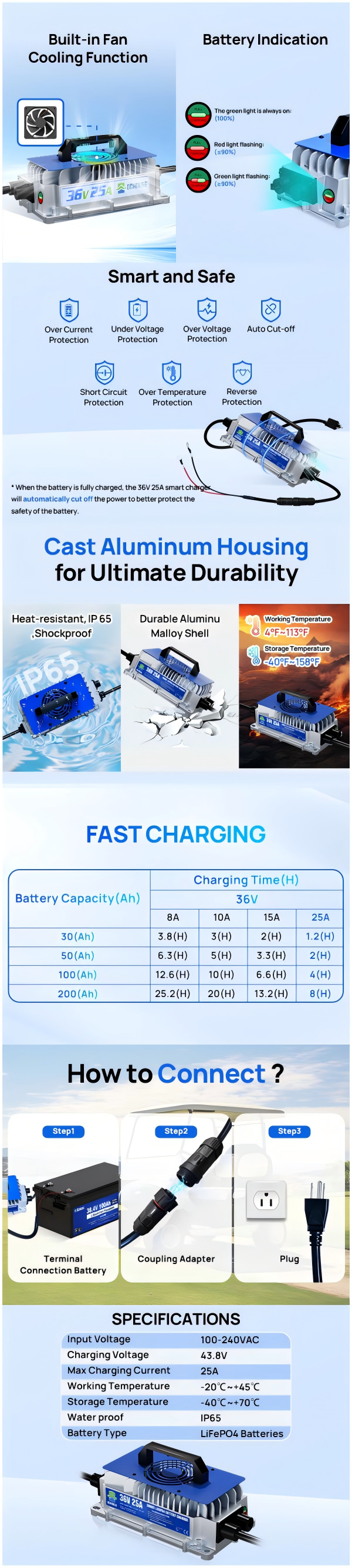 36V 100Ah 2.0 LiFePO4 Bluetooth Flame-retardant ABS Case Battery & Charger