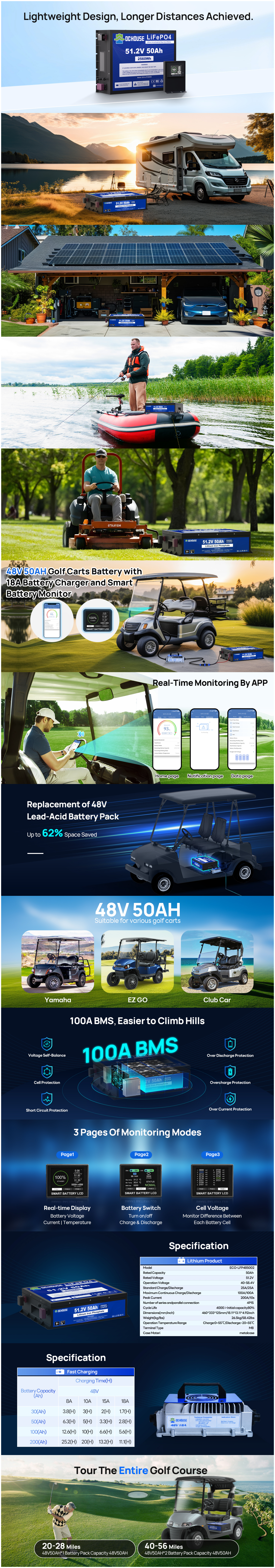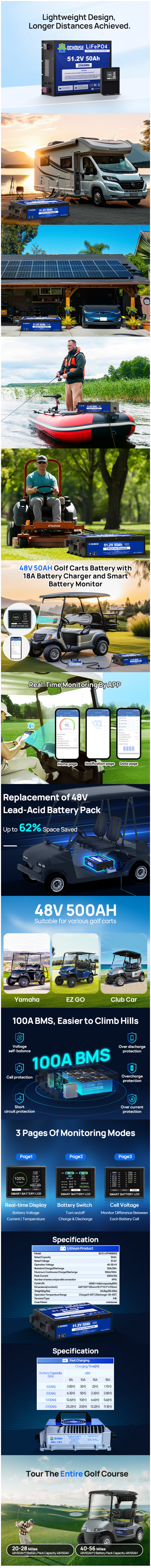 DC HOUSE Durable 48V 50Ah LiFePO4 Metal Case Battery with Charger - Bluetooth & Low Temp Protection for Golf Carts